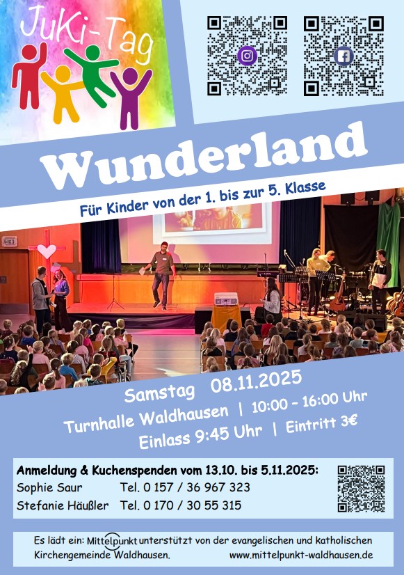 Glaube macht Spaß! Das erfahren die Besucherinnen und Besucher beim Juki-Tag. Dieser findet meist einmal im Jahr in der Turnhalle Waldhausen statt, die dann zuverlässig bis auf den letzten Platz belegt ist. Denn der Tag ist vollgepackt mit allem, was Kinder von der ersten bis zur fünften Klasse lieben: ein spannendes Theaterstück oder ein unterhaltsamer Film zu einem christlichen Thema, fetzige Lieder mit Ohrwurmgarantie von unserer Band, mitreißende Spiele, tolle Bastel- und Sportangebote und vieles mehr. Ein leckeres Mittagessen, Getränke und Nachmittagssnacks gehören natürlich auch dazu. Den ganzen Tag über steht Jesus im Mittelpunkt und gemeinsam mit den Kindern erfahren wir, was Glaube alles sein kann und vertiefen dazu jedes Jahr ein anderes christliches Thema.